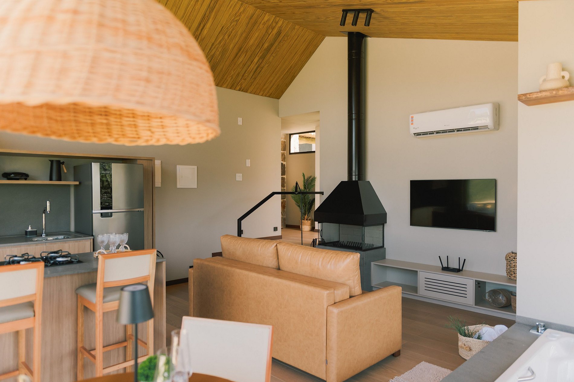 Todos os bangalôs dispõe de: Cozinha equipada com churrasqueira; Sala de TV com lareira para maior conforto no inverno; Ar condicionado; Wi-fi; Fechadura eletrônica para self check-in; Banheira de hidromassagem com vista para a natureza; Lavabo; Aquecimento de água à gás; Suíte com cama queen e vista panorâmica; Roupas de cama, banho e roupões de alta qualidade; Varanda privativa para desfrutar do silêncio e do clima ameno da serra; Estacionamento privativo.