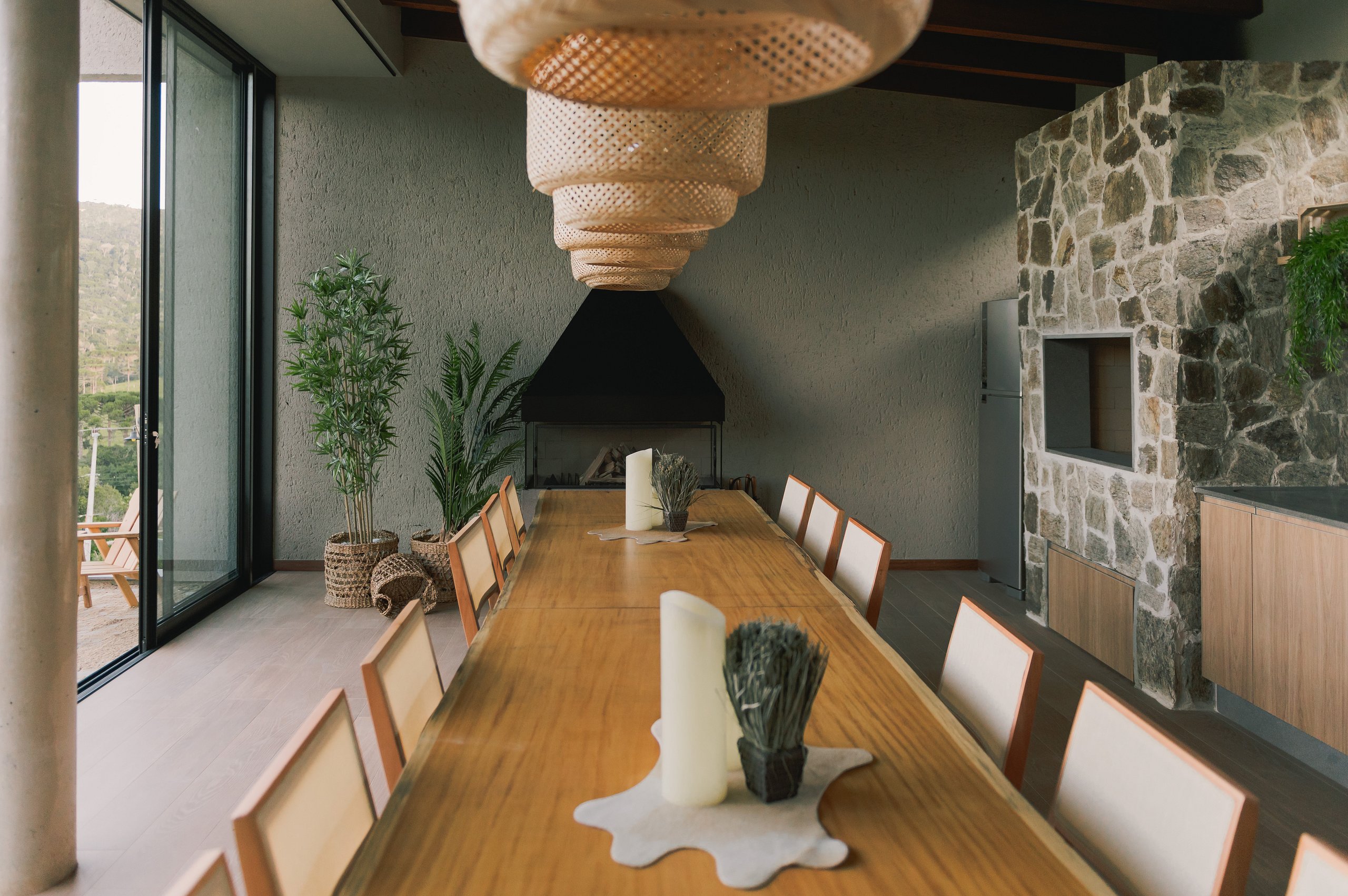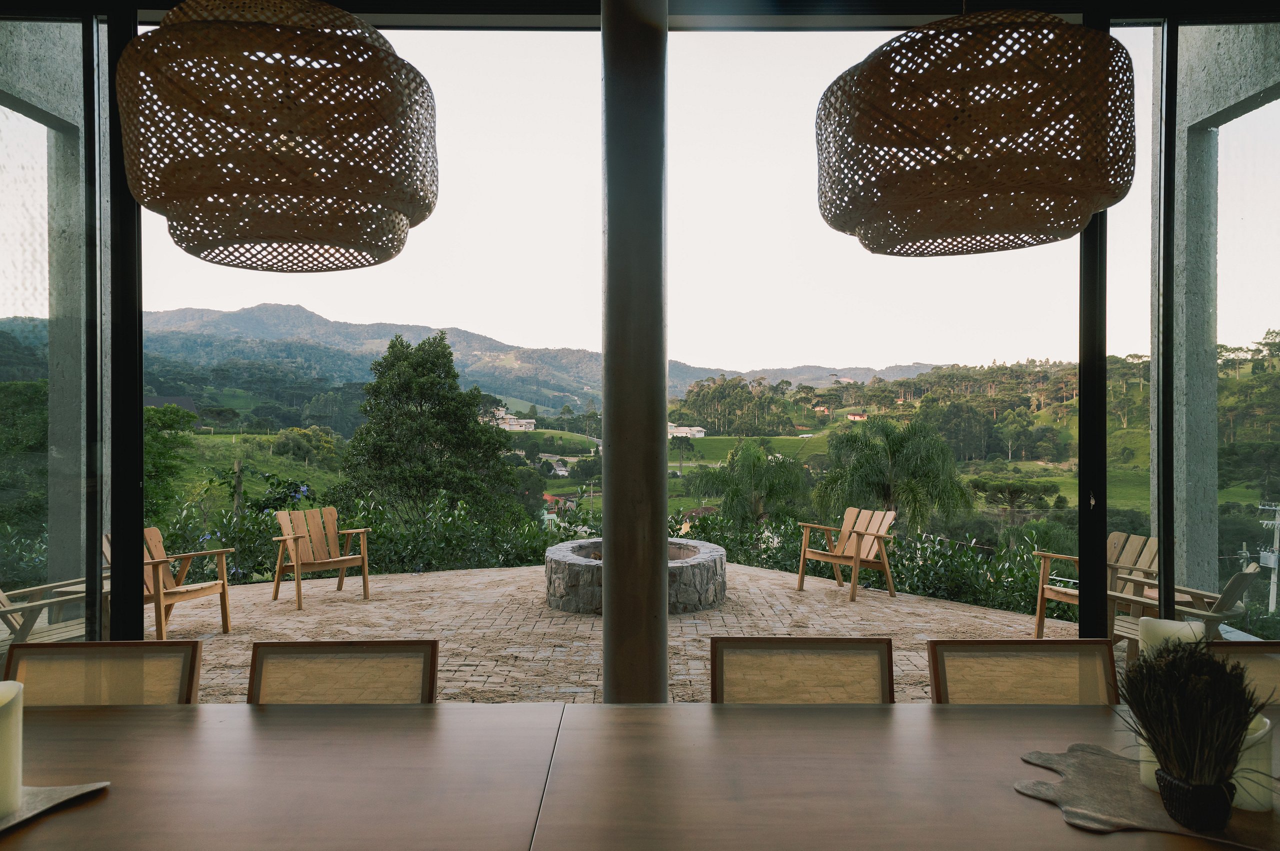 O espaço é rústico com paredes de pedra corten e janelas de vidro permitindo que a luz natural adentre ao ambiente e conecte os convidados à beleza do cenário externo.