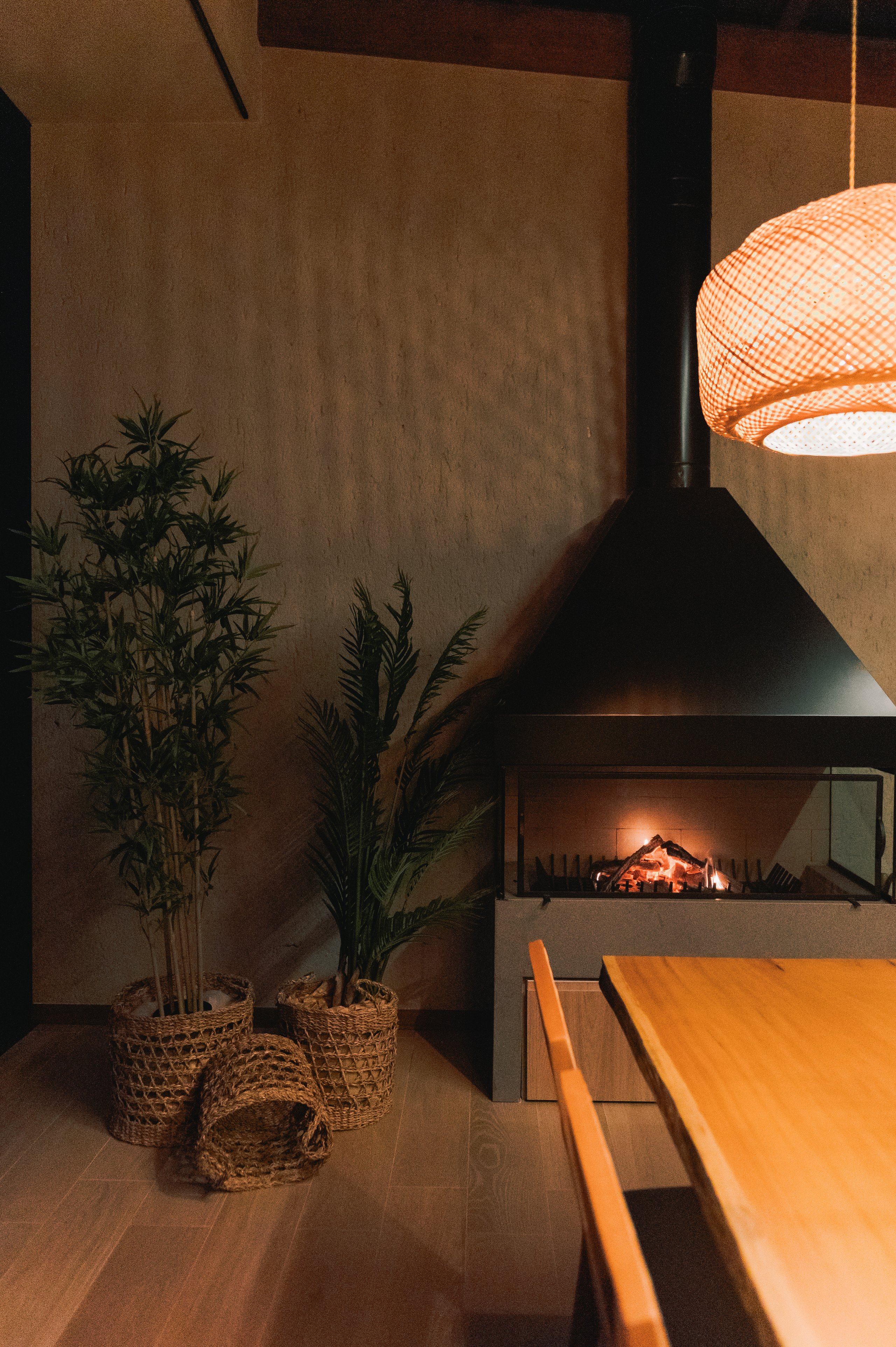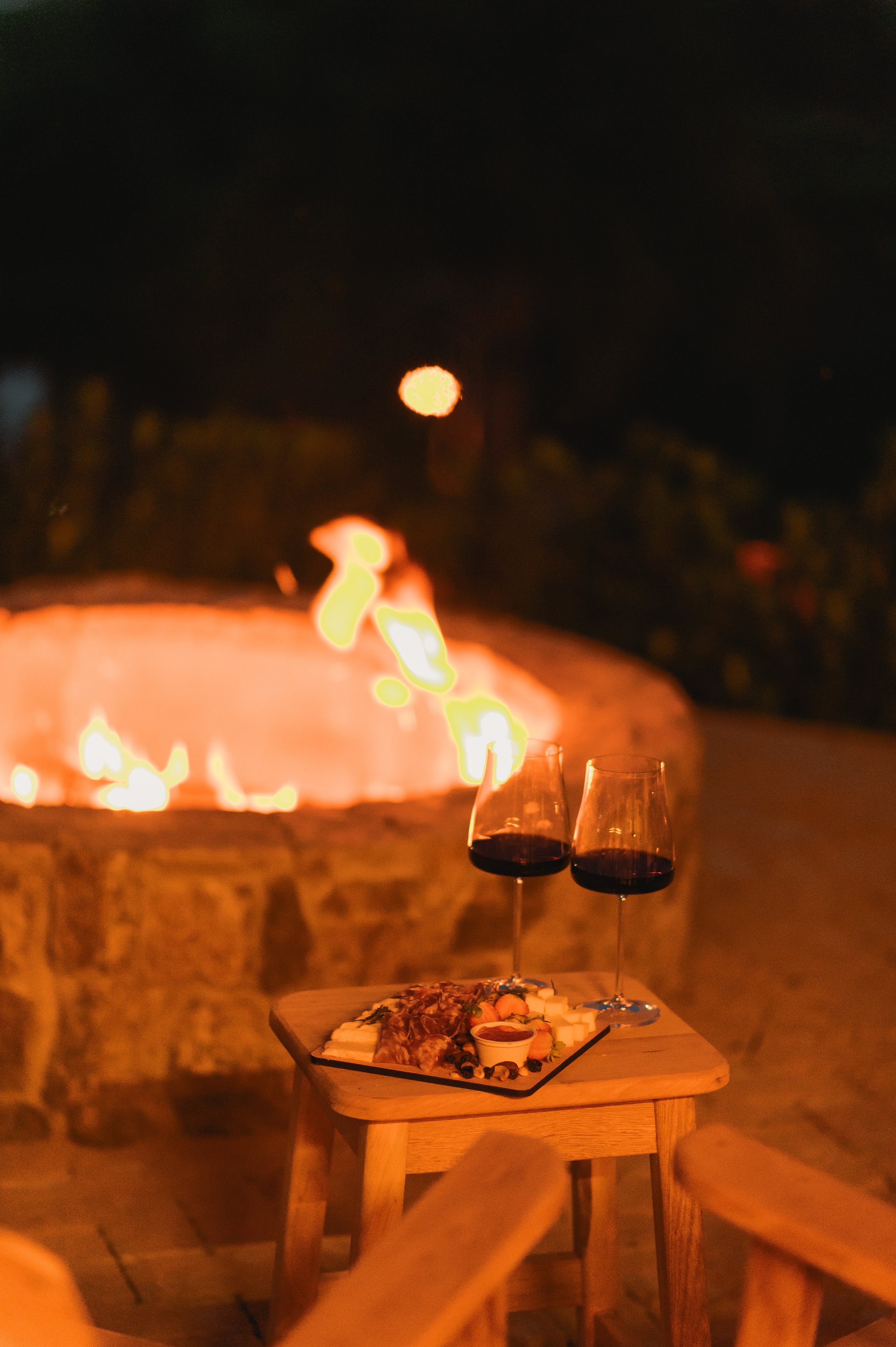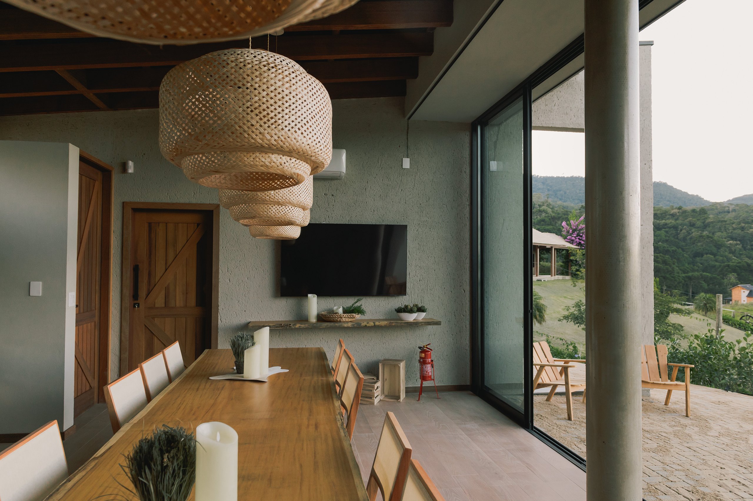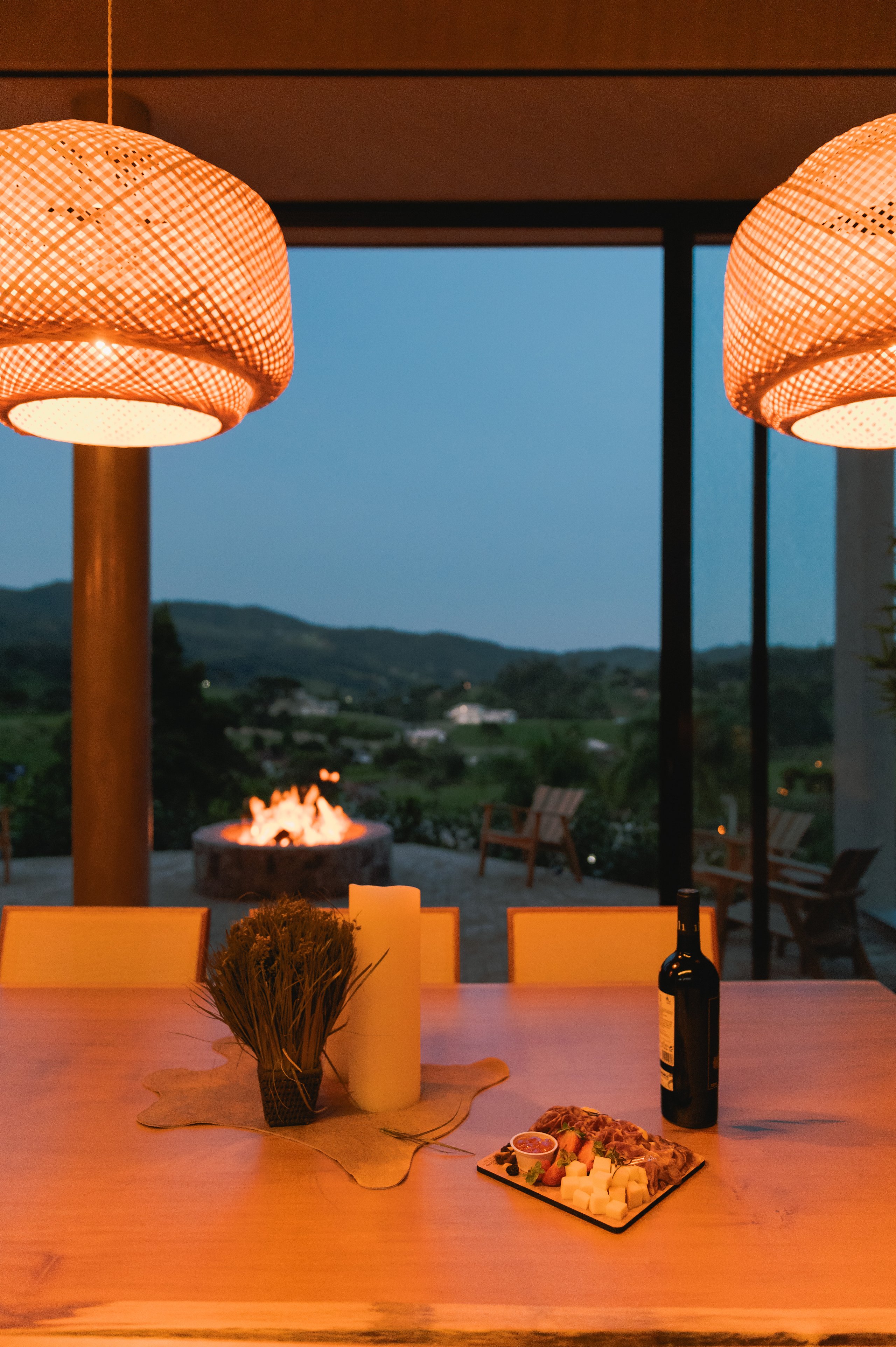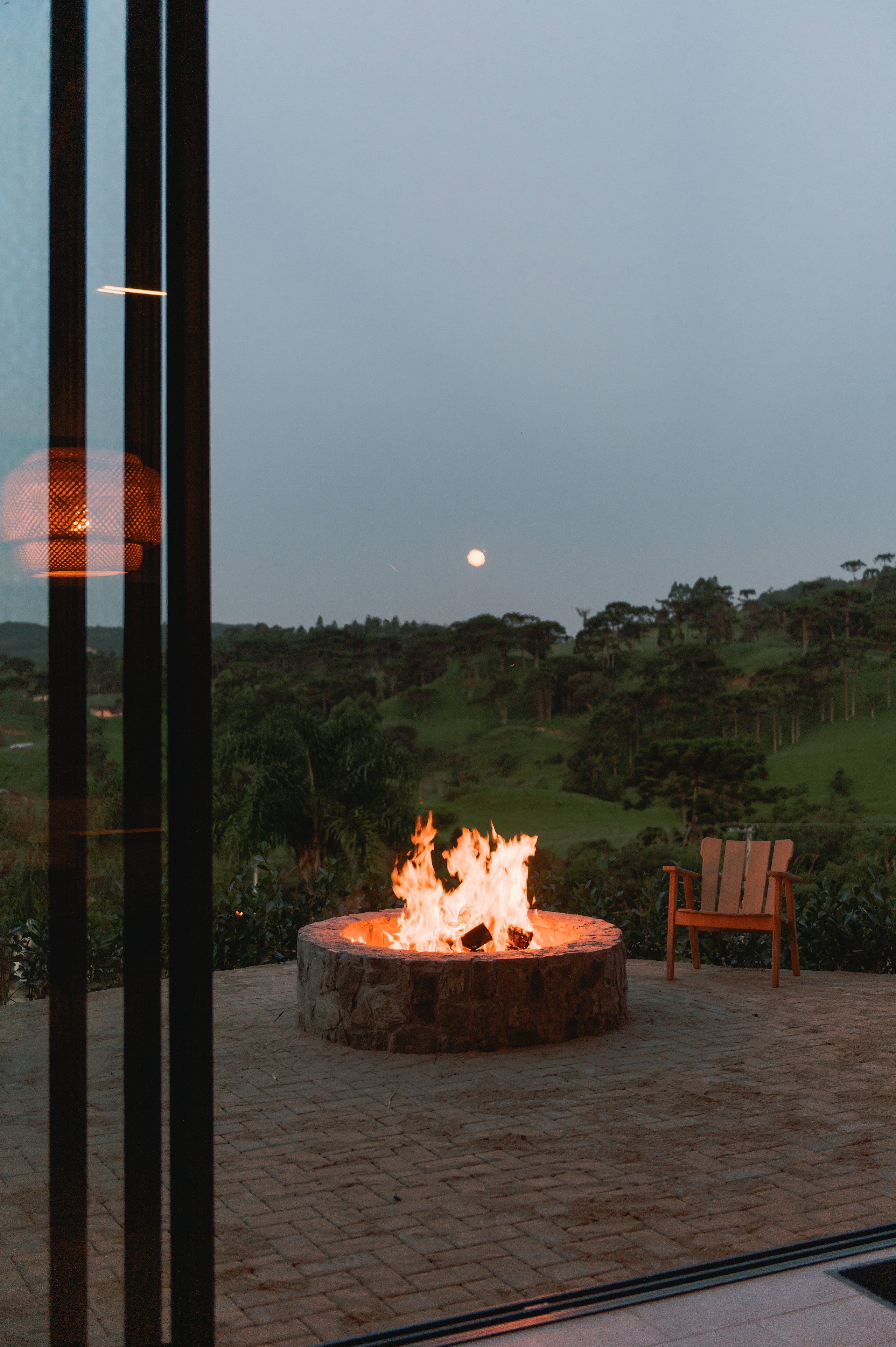 Na varanda, um fire pit - lareira ao ar livre - completa a experiência. Ao redor do fire pit, cadeiras confortáveis são dispostas para que os convidados possam se reunir e criar memórias inesquecíveis em um ambiente único e com uma atmosfera acolhedora.